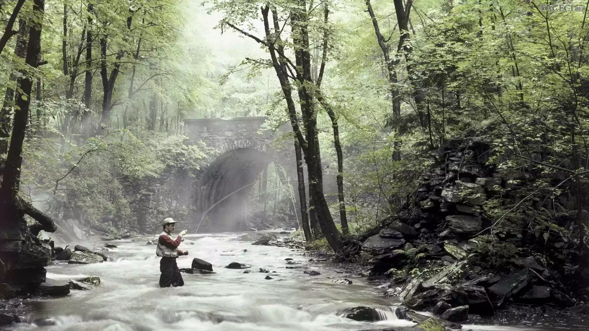 Kamienie, Las, Mostek, Wędkarz, Rzeka - faceci.biz